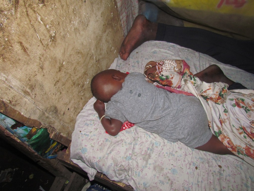 After I finished testing all the girls and some of their clients (all of which were HIV negative to my suprise) I went into the area to check on Fatimah. As I entered the little slit in the wall a nasty little man came out. He reeked of alcohol and was tightening up his belt, it was clear he just finshed up his business. Fatimah was on the bottom bunk in the first room with her little baby sleeping at her feet. I felt her head, she was running a fever and was sweaty. It looked like she had just finished a marathon. Her eyes were half closed and all I could see was the whites of her eyes. I snapped my fingers in front of her face in an attempt to wake her up, no response, and gently placed my fingers on her carotid artery to feel her pulse.