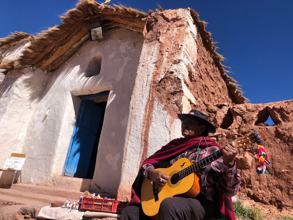 Hernesto Álvarez Colque tocaba su guitarra por nosotros, y nos explicó sobre su esposa quien esta escribiendo un libro sobre su vida para preservar la historia. Hernesto esta analfabeta. Vive en la puebla de Machuca, donde el ayuda a mantener la iglesia y celebrar la cultura de su gente. Ellos dan gracias a Pachamama con las ofrendas de vino y hierbas. Esta seguro que la historia de los Atacameños continuará por sus hijos. Gracias a Hernesto por la música y palabras.