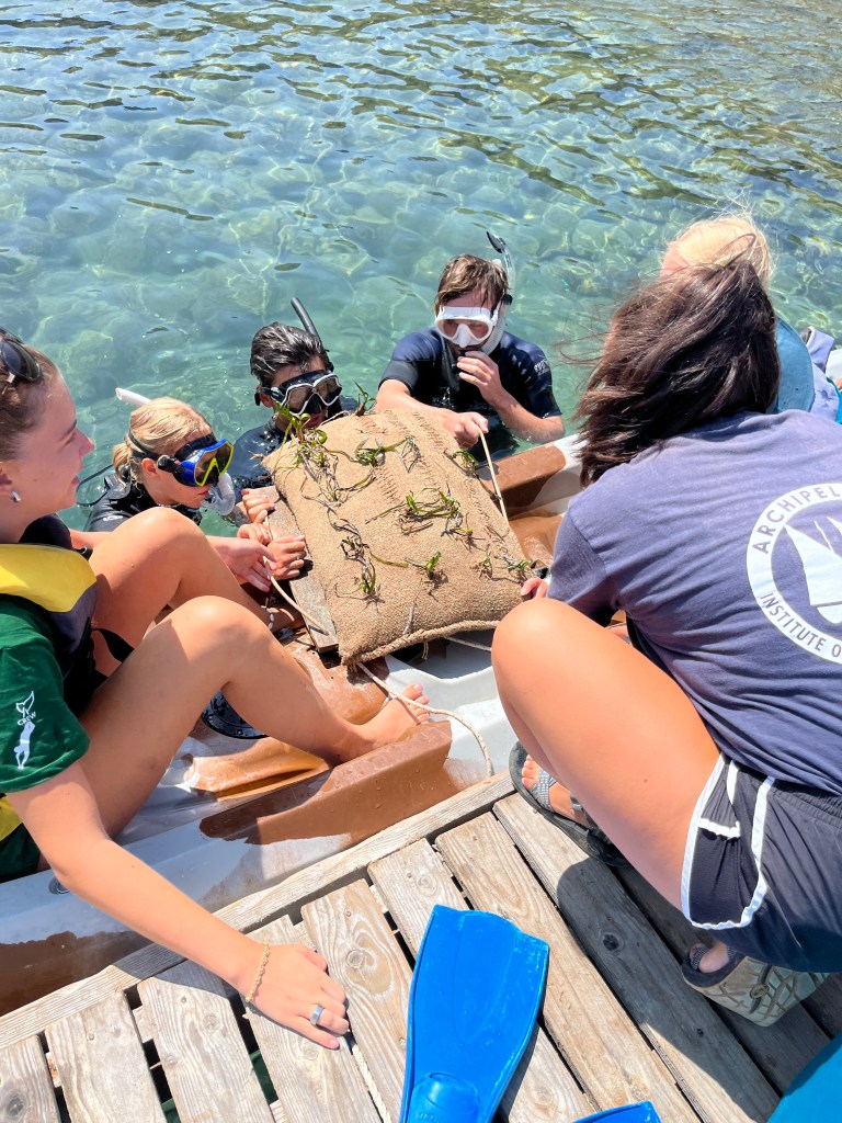 On top of the plastic collection I worked on several other projects this summer. I studied species of the Mediterranean Sea and learned how to properly identify them in the water. We would write down the species we saw with underwater paper and count how many of each to quantify them. We keep data on the abundance of species and also on invasive/alien species. I also helped with efforts to replant seagrass meadows, which have been shrinking due to climate change. This is an extremely arduous process because each seed or fragment must be planted by hand into hand-sewn biodegradable burlap bags. We collect seeds and uprooted fragments during our surveys as well as particular sediment from the ocean floor to use for planting. In total, I have helped plant over 1,000 individual seagrass seeds and fragments!